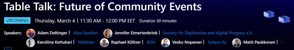 - 11th of March at 8am CET: Finnish version of Microsoft Teams Spotlight – Recap / Road to Ignite 2021 Edition . Relevant only if you understand Finnish.