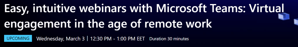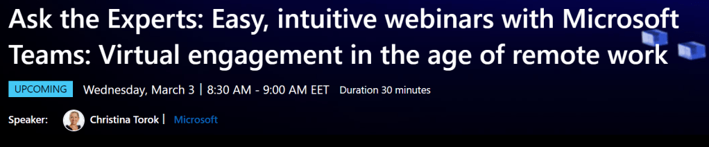 - Q&A team member: Easy, intuitive webinars with Microsoft Teams: Virtual engagement in the age of remote work Wednesday, March 3 | 12:30 PM – 1:00 PM EET