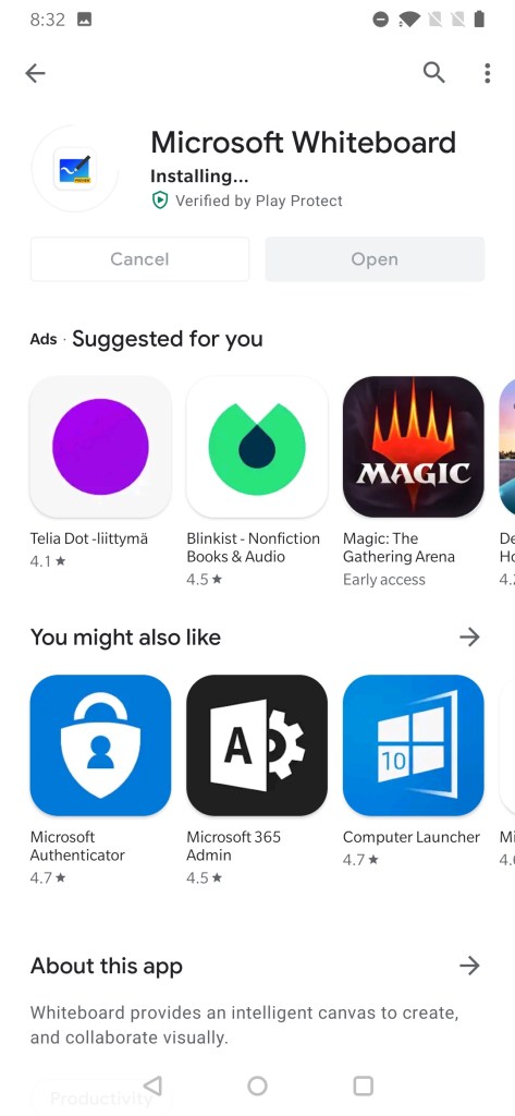 Microsoft Whiteboard is easy to install to Android devices: just search for Microsoft Whiteboard in the Play store and start the installation.