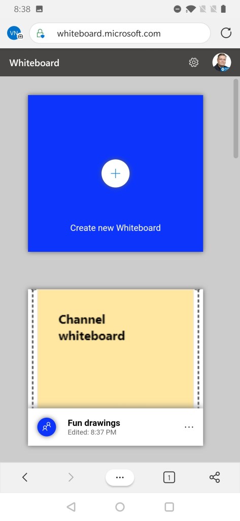 aaaaand we end up in the pure Browser version. At least it didn’t ask for a login since my mobile Edge was already signed into Whiteboard. But since the experience is the same it is not a big deal (I do lose a bit of screen in it though). Closing the Whiteboard gets me back to the main Whiteboard web screen where I can rejoin it normally.