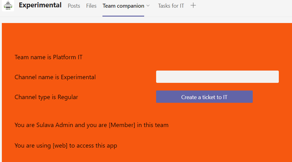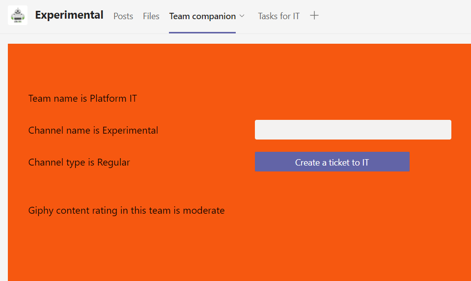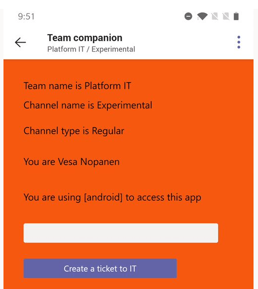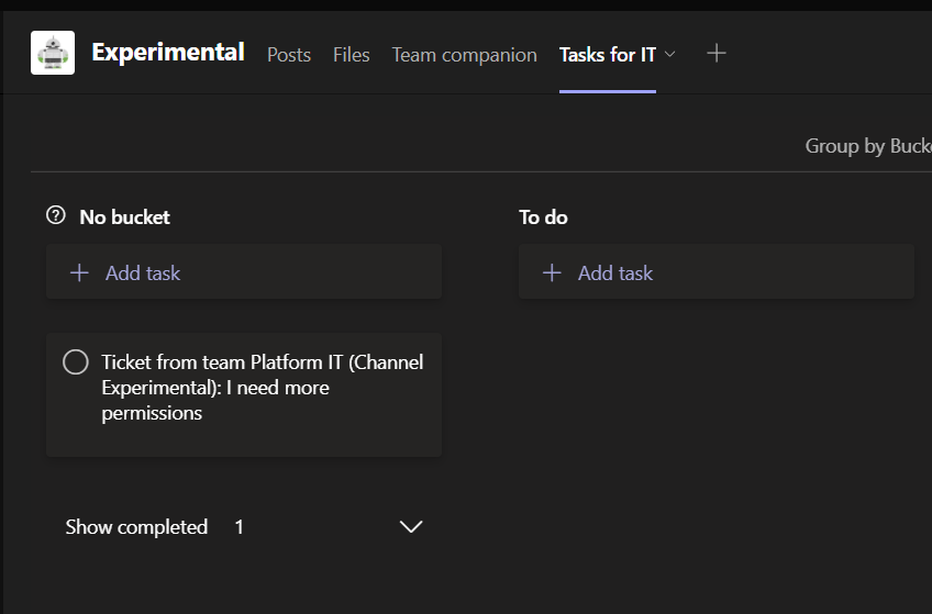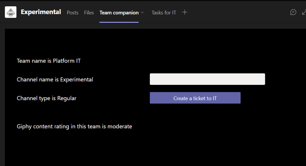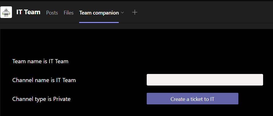 In the example I created the application that would be used to contact IT. Adding a ticket to IT adds it to IT team’s planner with information about the originating team and channel attached into it. In more real life use case the team and channel information can be used to automatically show right data in the right context.
