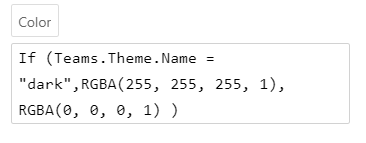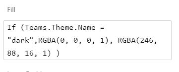 In this Fill-part Teams.Theme.Name tells what is the name of theme currently used in Teams. If theme is switched the app can react instantly to that. These are just like Power Fx (or more commonly Excel formulas) that are recalculated instantly. In this example it is not in the dark mode.