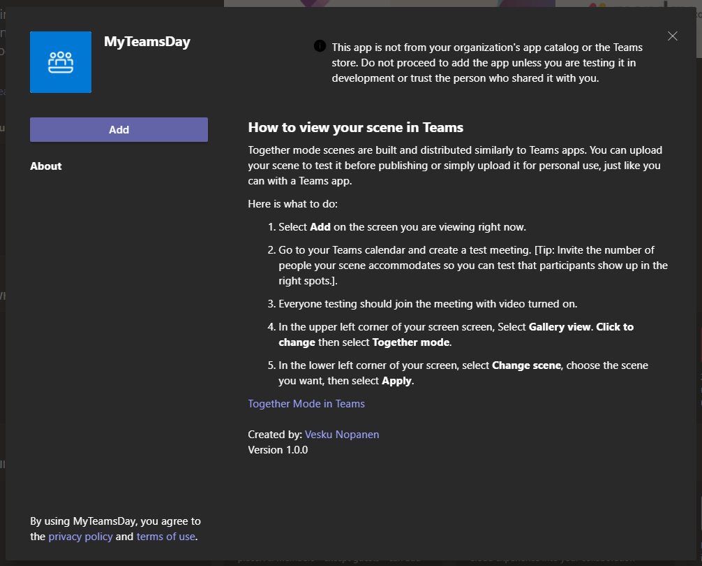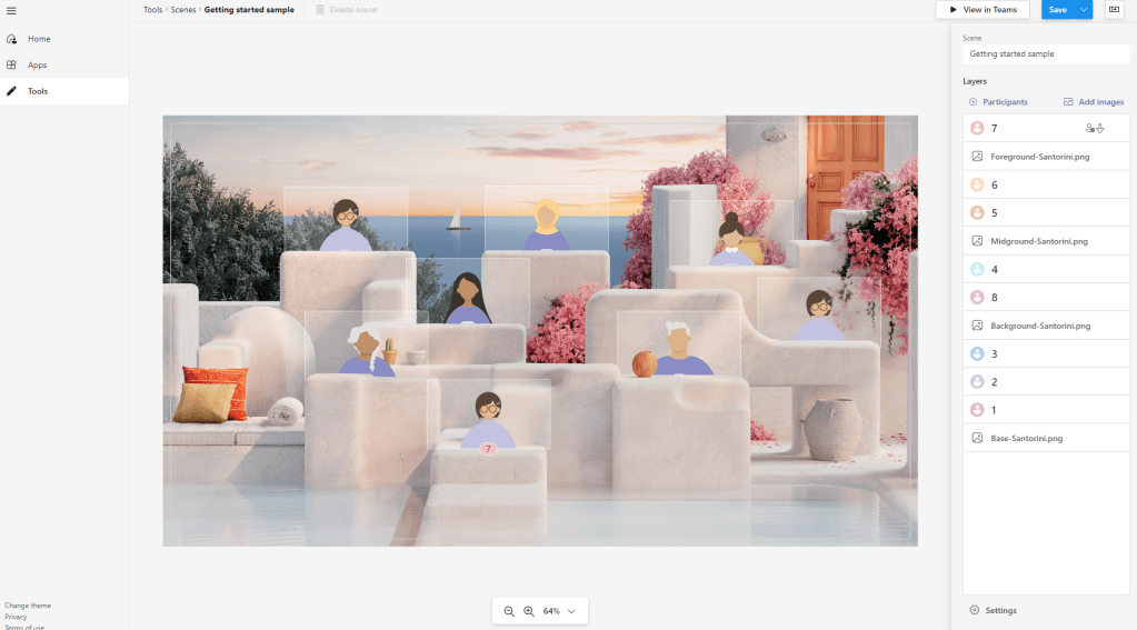 Start by going to Developer Portal. You will still require permissions to add applications to Teams since scenes are distributed as Teams apps. The end result, when you distribute it to Teams, will look like this: