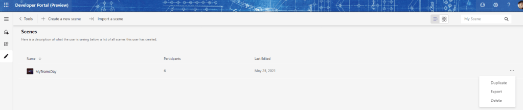 I also discovered that if you switch to the List view of the scenes in the Developer Portal, you get the possibility to duplicate the scenes.