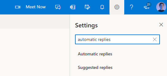 On top right at Outlook web you can go ahead search for automatic replies in settings. Open it by clicking on search result Automatic replies.