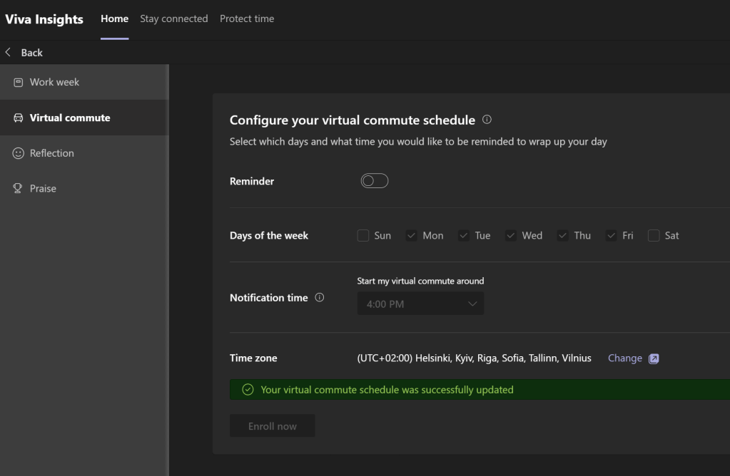 I strongly recommend turning off reminders to Viva Insights for Virtual commute, Reflection and Praise for your vacation time. You only end up having unnecessary notifications in your Teams that make it more difficult to find out the real notifications you want to check after your vacation, when you are back at work.