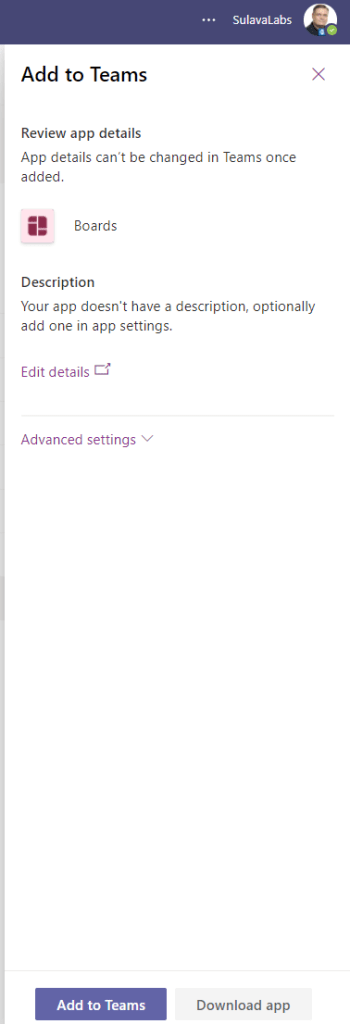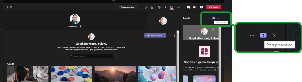We can see that there is now a new button that allows you to “Start presenting” your application to others! This is why you need to include meetingSidePanel context: it is the only place where you will be able to activate application sharing to meeting stage. It is a good idea to create a smart application that can display different content (or same content in a different layout) at meeting side panel. Unlike in this example when using out of the box Boards as a test-bed.