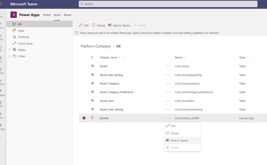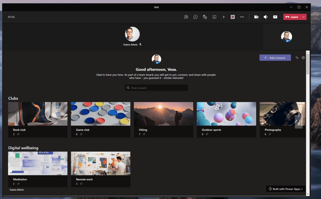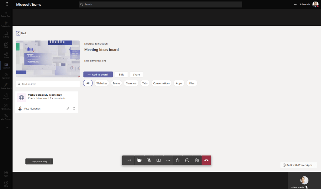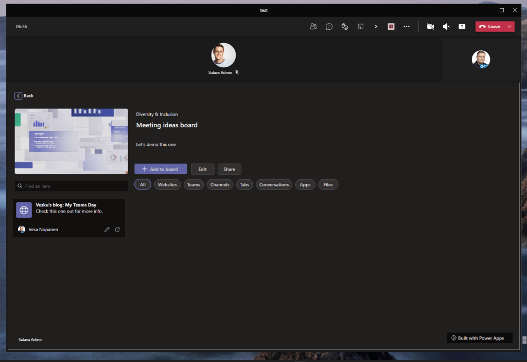 Since I didn’t have any ready collaborative Power App application right available right now, I decided to test this feature with a typical Power App. Namely the new Boards application template. This way I do loose some of the collaborative app aspect, but it allows to share contents of the application to meeting participants (in-organization only, externals don’t have access to Power Apps) in a way that everyone can enter their inputs. It would require a bit of developing on the canvas to reflect everyone’s changes in real time but even as it is it can be used to give access to application to everyone and thus everyone can start adding their input during the meeting. Use cases could be things like scrum card points, adding tasks or backlog items, feedback sessions or perhaps going through the issue reporting.