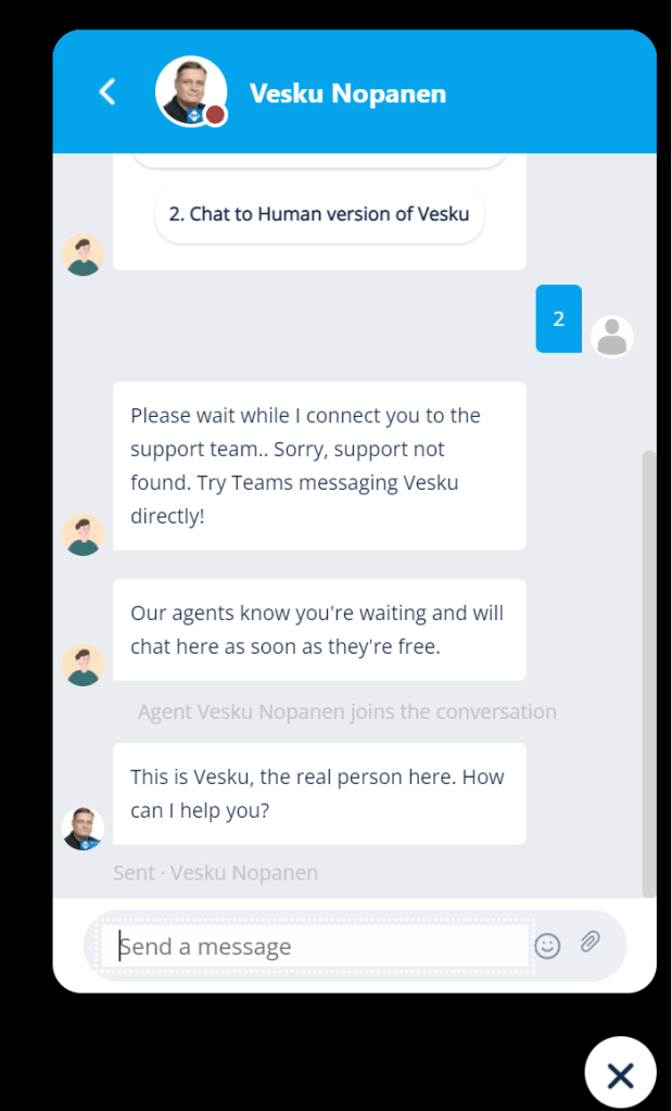 Once you start the conversation you can choose with available options. If you have your own bot running in the backend you can have a lot more smarter experience. But for no-code “easy way to connect webchat to Teams” this does the job.