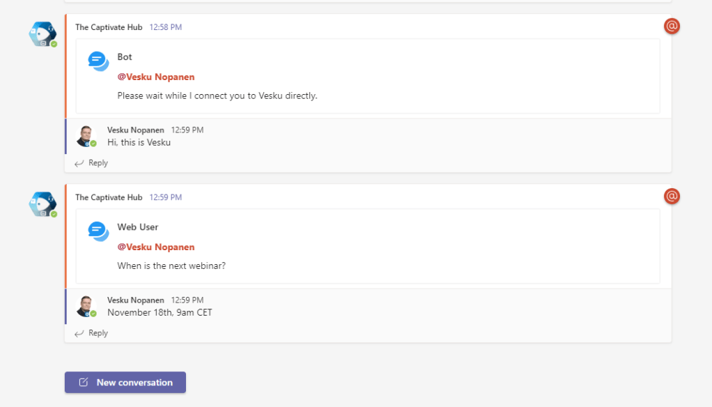 This is not likely to be the only similar solution out there – but despite the “not very easy to follow discussion in channels” the ability to route the same experience to various channels is very interesting and useful. Instead of checking in on various sources conversations can be replied from Teams messages.
