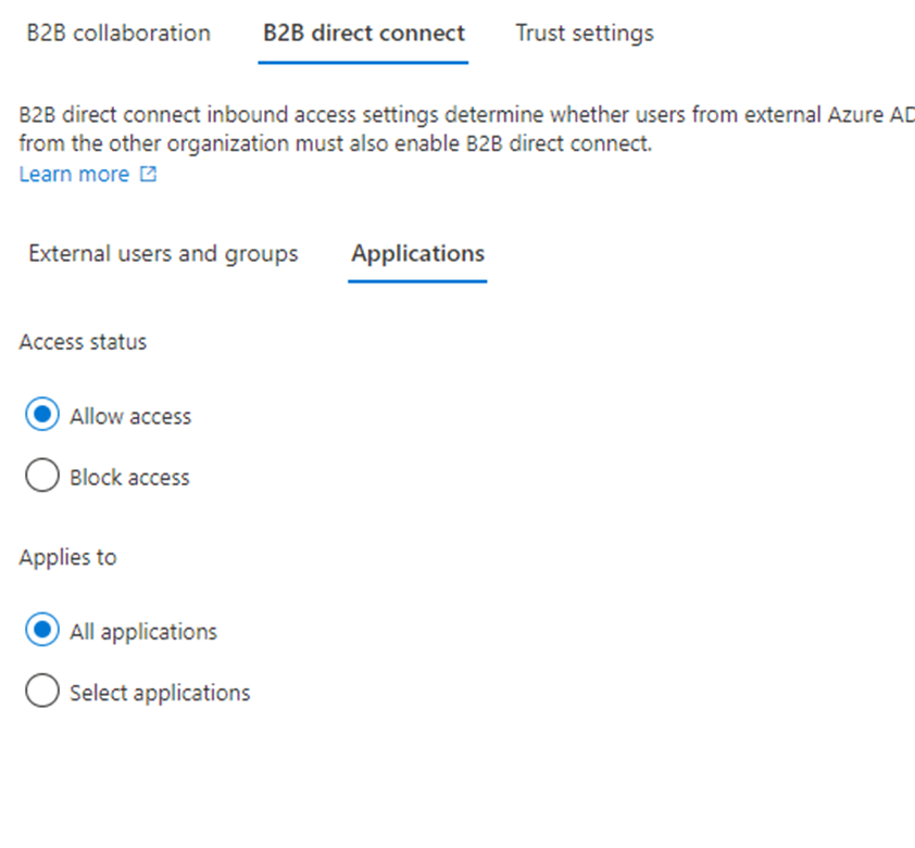 You need to change defaults on inbound (inviting externals to your Shared Channels) and outbound (allowing your employees to be invited to Shared Channels in other organizations) to enabled if you want the full federation. I have also enabled All Applications. Currently there is only Office 365, but the list is expected to grow.