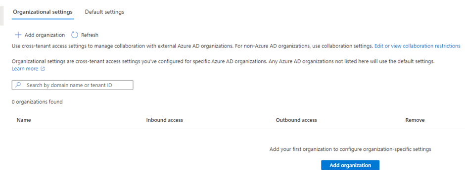 Adding the right tenant name shows you the name and tenantID on screen. After confirming that you can see the organization in your list to modify accesses inbound and/or outbound.