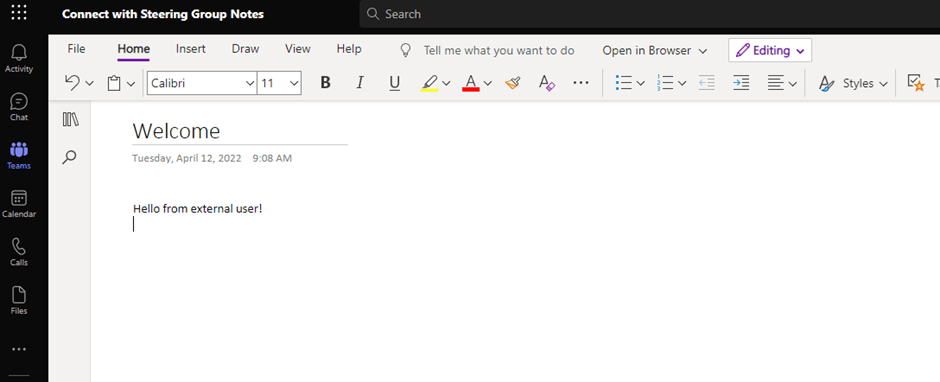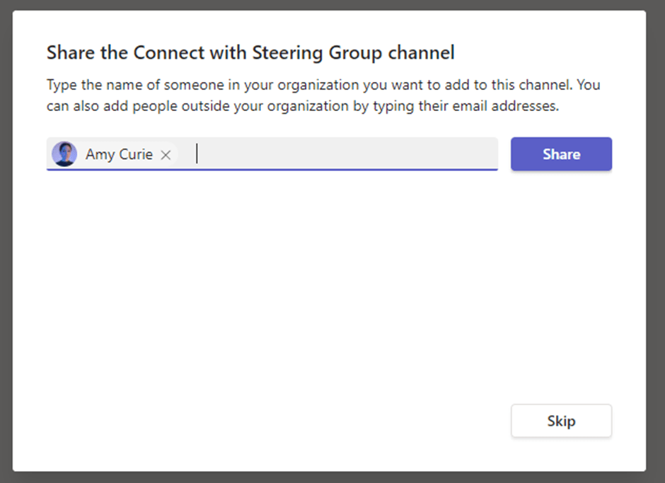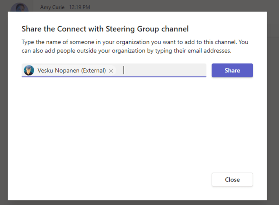 Let’s share the Connect with Steering Group -channel with an external person. This could be, for example, a board member. I am going to share it with external individual.