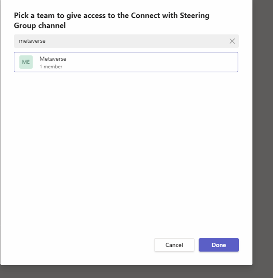We can go ahead and share this with the Metaverse-team. In this case I am the owner of the team so I will choose “With a team you own”. In case I would share a channel this a team where I am not an owner the owners would get a notification and request to add the channel to one of their owned teams. So team owners quite a good control what’s being added to their team.