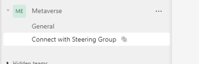 Looking from Amy’s perspective – this is like it looks to her. She is not part of the Metaverse team, but the Channel was shared with her individually. Looking at our team list, we can see Steering Group team is there – but only the Connect with Steering Group channel is visible.