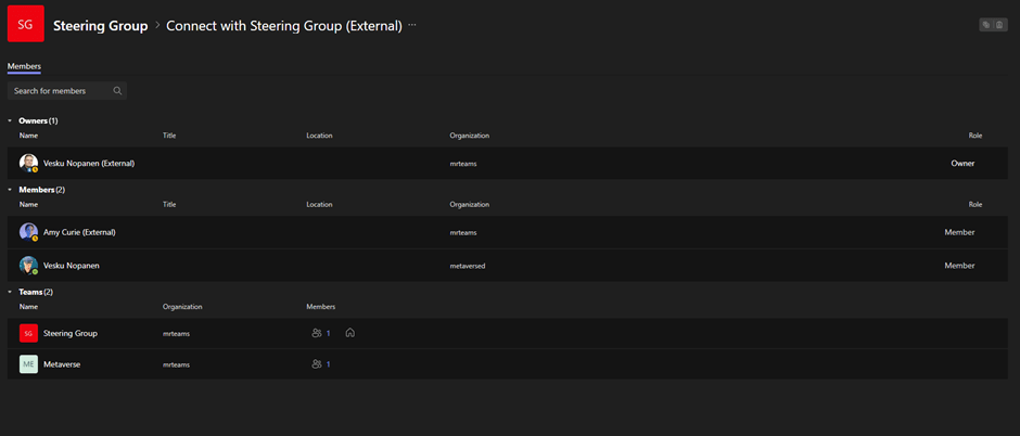 When I now look at the Metaverse team, I can see shared channel included there – just like any other channel in the team. Since this is internal sharing, there isn’t any warning about externals.
