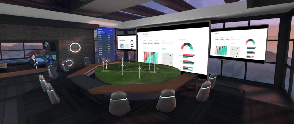 - Operation room or “war room” or “drop in space” can contain multiple applications and displays to make sure people are up to date and have access to the relevant information. The picture is showing PowerBI and/or PowerApps representation of the data. In my own visioning I see low-code/no-code (=Power Platform) as a way to customize your metaverse with your own applications. Just like you can start to create Live Share and Collaborative Apps to Teams. In the metaverse you don’t need to install these (or access them separately) for everyone – just add them to the space.