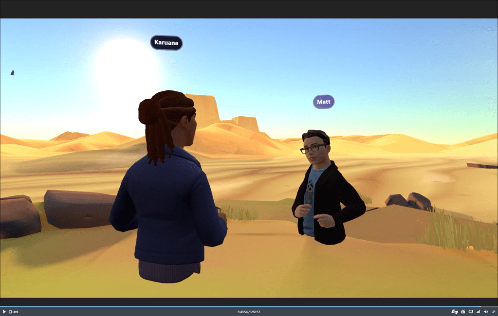 - You dont’ just do meetings, but you can drop into persistent Metaverse spaces to keep on working with others. Whatever you do there will remain and people dropping into the space later can continue your work.