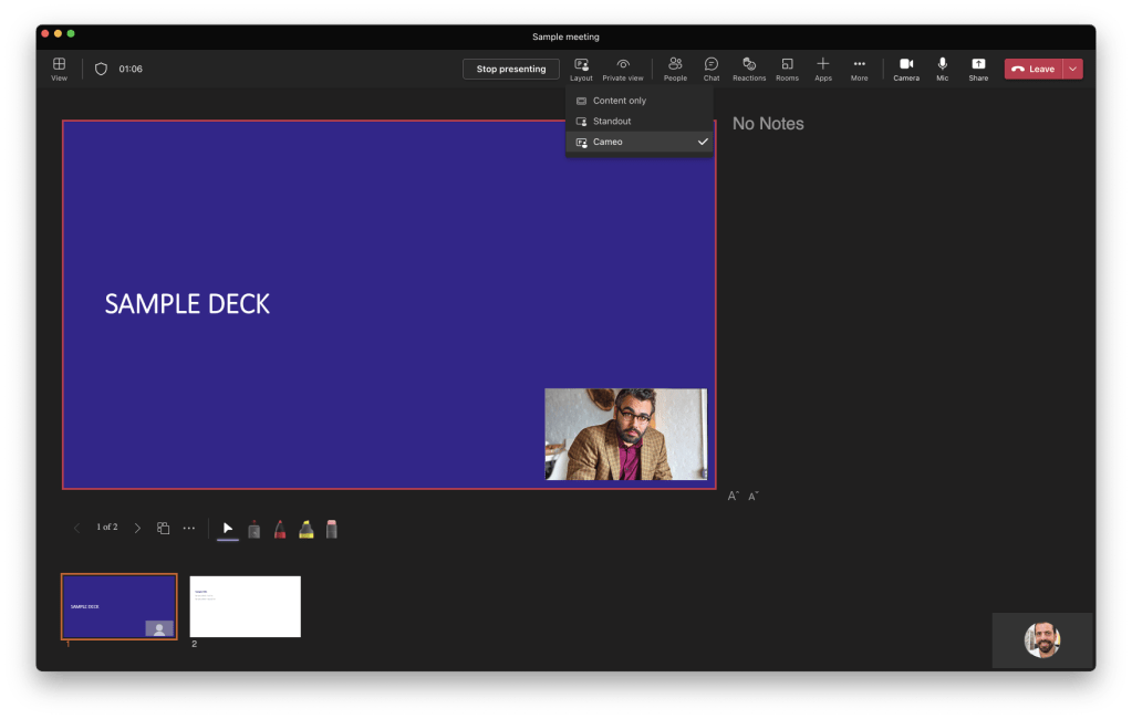 Note Recording and client Limitation: – Cameo in PowerPoint Live will not be shown in the recording, web or mobile clients. In short Cameo in PowerPoint Live only supports Desktop version of Teams when it emerges. Support for other clients and recording will be very likely added later.