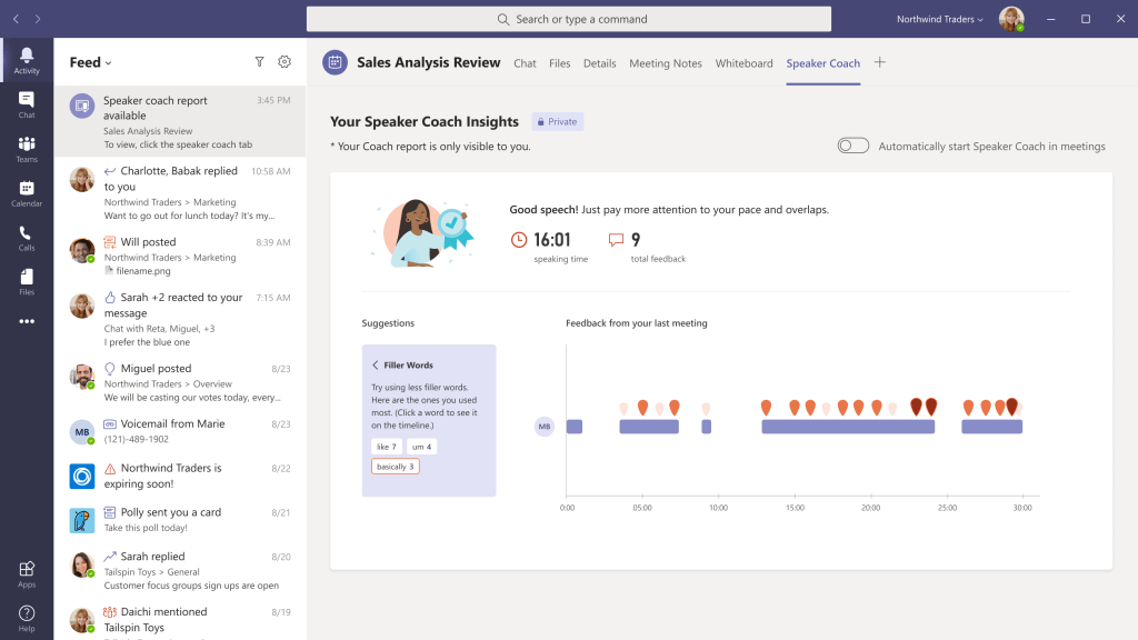 Speaker Coach provides private, personalized feedback on your speaking and presentation skills in both real-time as well as post-meeting in a summary. Rolling out by the end of July.