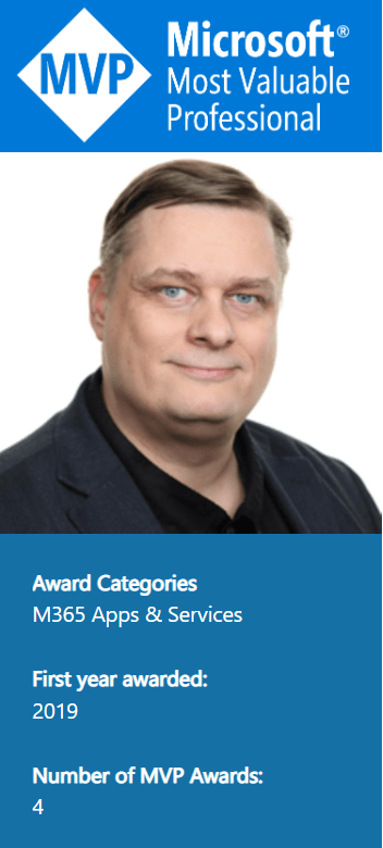 Tuesday evening I got the information I was renewed as MVP for my 4rd year. I am extremely happy and very honored about this! Being a Microsoft MVP has been great experience, because the community rocks! Sharing knowledge and insights, having fun and making new friends, meeting people in person at events and impacting & helping numerous people by the work done at the community. Big thank you for all of you everyone in the community like my good friends & partners in the Metaverse One (and in Teams Nation earlier) Chris Hoard, Matti Paukkonen, Adam Deltinger, Chris Webb and Paul Dredge and of course countless others friends in the community! Special thanks to Microsoft Teams PG and especially Laurie Pottmeyer who is taking care of us “Teams MVPs”.