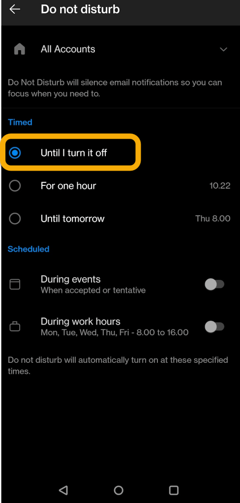 How to turn on Do Not Disturb in Outlook Mobile client for all accounts