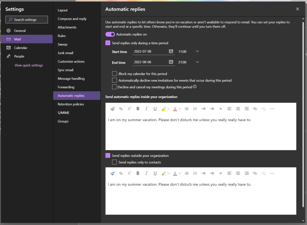 You are instantly teleported to Automatic replies page. In here you can see Out of Office has been set. You can also check Block my calendar for this period, Automatically decline new invitations and even automatically Decline and cancel all meetings that has been scheduled for your vacation time. This saves the time to remove them individually.
