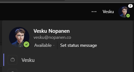 And finally you want to set Out of Office so that Teams shows your colleagues that you are not working. Teams and Outlook sync these settings so it is enough to do the setting in one place â it will be automatically reflected on the other one. We of course start this with Teams.
