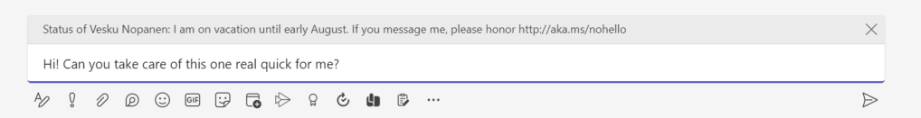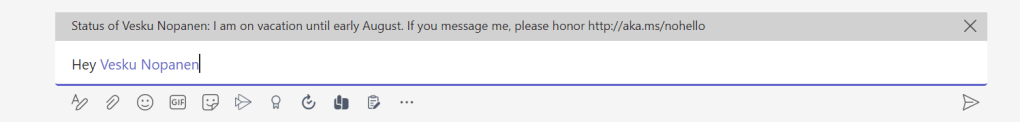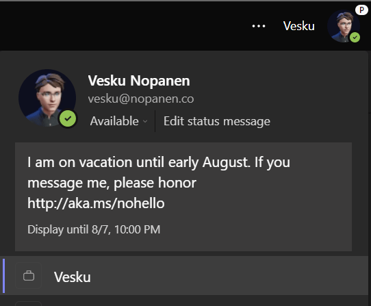 You can also set a status message for your Teams. It will be displayed for your colleagues when they try to send you a chat or atmention you on channels. This feature is useful outside of vacations as well.