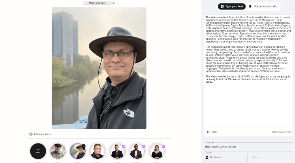 One good example of this tech are “digital twins of people” or “talking heads” that can be used to create short videos that look like you are the one doing the speaking. But instead of your own voice (this could be done as well, with synthetic voice services) your are using one of pre-configured ones. These talking head videos are easy to create and they often have also an API that allows creation programmatically. Think use cases for your onboarding or training use, to your Metaverse or Intranet spaces or showrooms. On top of these you can speak in multiple languages. The benefit is the friendly and known face but easiness to update and create materials whenever needed. Without a studio.