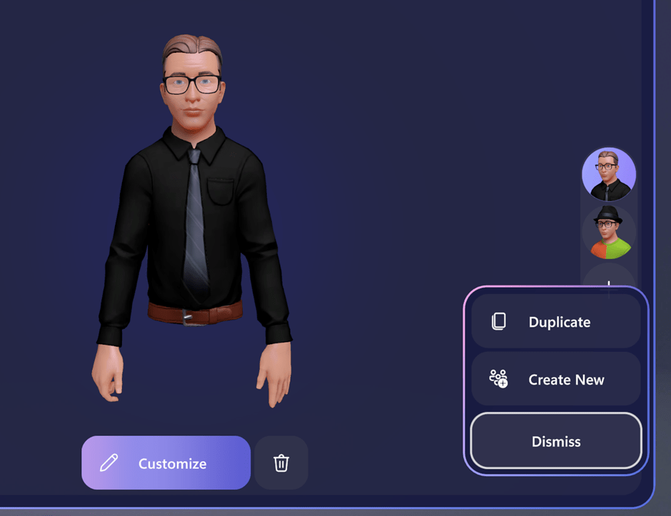 When I hit the plus sign, I can choose to duplicate existing avatar or create a brand new one. This means that I can have three avatars that could be really different – even be different genders. And if you just want to change the outfit, it makes sense to duplicate your avatar to save you the trouble for customizing all features again.