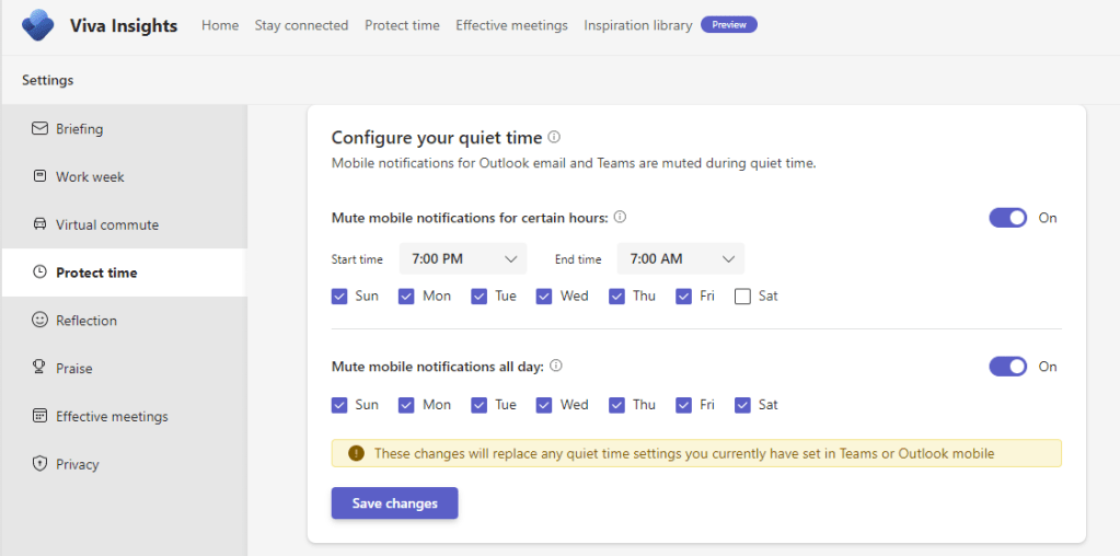 When and if you have a break during holidays, don’t forget to set your Quiet Hours / Days so you don’t get notifications that would break your off-work time. The easiest way to do this is to visit Viva Insights and set Quiet Days. It will take care of those for both Outlook and Teams mobile.