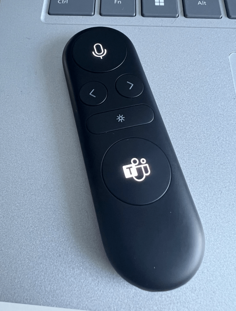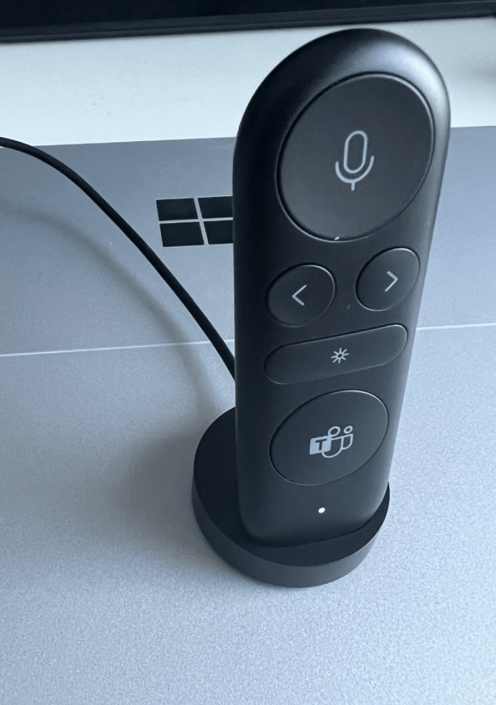 The Microsoft Presenter+ is a really professional looking device. Lightweight, small and yet packs all the relevant info I need for presentations. Big mute / unmute button that is lit white when your mic is open. Microsoft Teams logo is also lit when you are in the meeting. Connection to Surface Laptop Studio was very smooth and no cables were needed. Surface noticed that there was a new device and after a short time Presenter was ready.