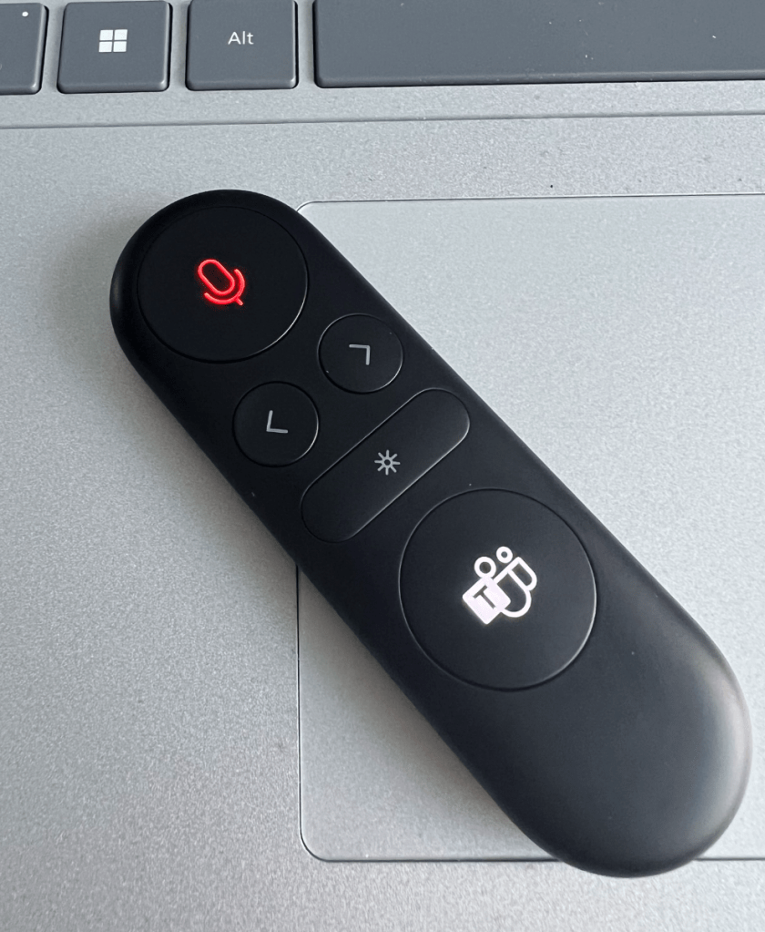 And even when I am not presenting, I like the mute/unmute in the presenter. It is a large and visual button that can be easily used at hand’s reach while maintaining camera contact. I use the presenter even when I am not actually presenting – but more as a companion for meeting.