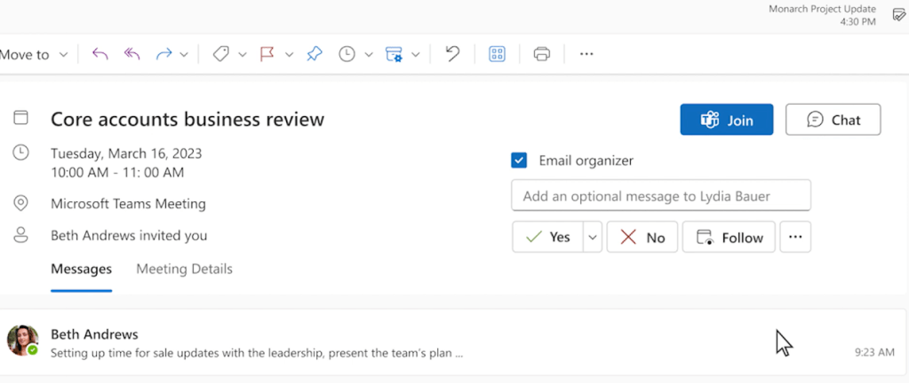 With Intelligent Recap you can choose to reply to meeting Follow, instead of just Yes or No. This will give you access to the recap once meeting has been concluded. This is one feature that will help massively to work both sync and async. Instead of joining the meeting, you can recap what it was about and what tasks were created – and check out notes as well. It it very likely that intelligent recap will require that meeting has been recorded & transcribed to gain full benefits of the feature.
