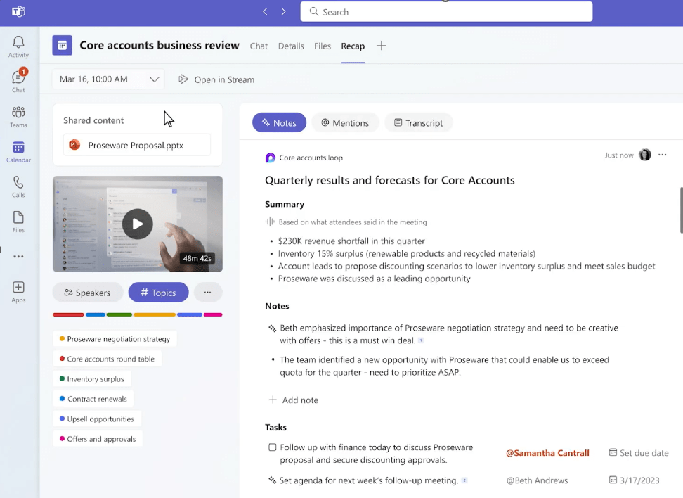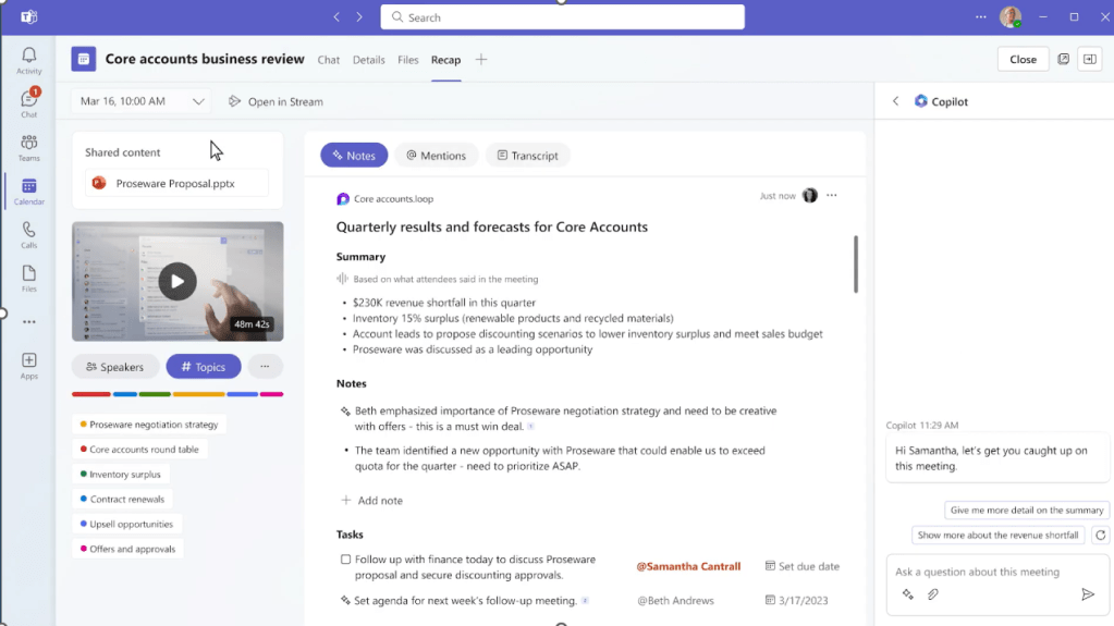 The Intelligent Recap will be a big changer on meetings – it allows us to catch up quickly on meetings we have missed fully or partially. See tasks that were created (either by AI picking them up or manually adding them) and notes highlights. Even without a Copilot it will bring value to busy people. Instead of reading through the transcript or watching the recording I can get more information with a quick glance to see if I need to dive into it, or is it just something I can skip.