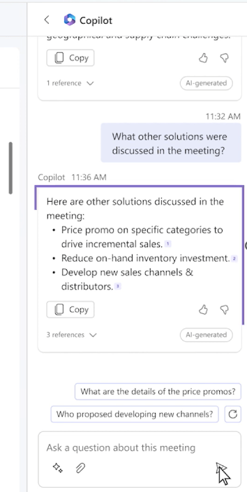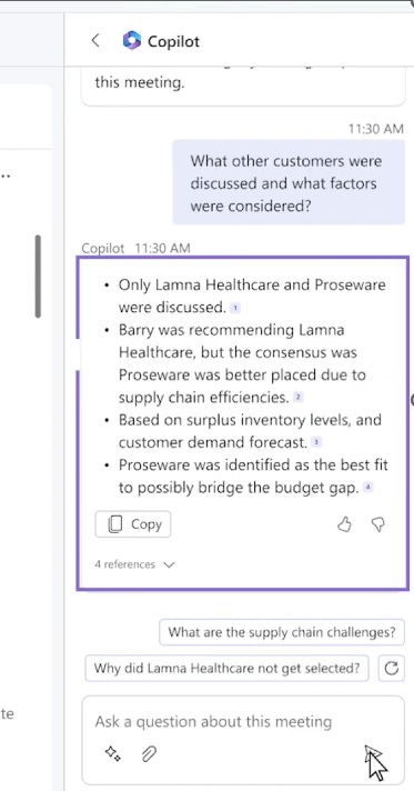And as with Copilot in all apps, you can check out where it got the information from. You get references to sources – including meeting transcripts.
