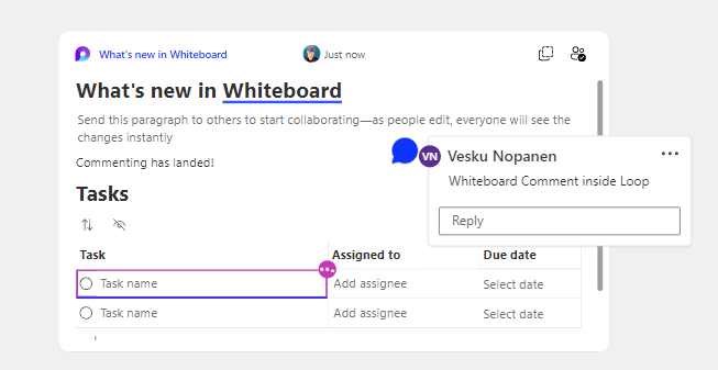 • Loop tables and task lists creation from inside Whiteboard (yes! no more need to first create a Loop component and then copy-paste it to the board)