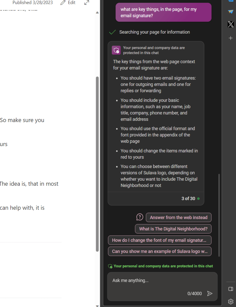 While I use the page summary quite often in public web site, I can also use it with our internal Intranet (SharePoint) pages. In this example I have some of our HR instructions open (since this is from my work tenant, I can’t show you all contents) and I want to know key things regarding email signature.