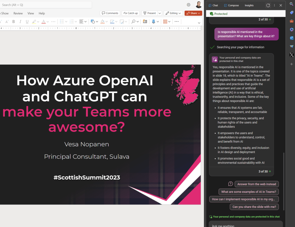 And it doesn’t stop there. I can open a PowerPoint presentation in PowerPoint Online and use Bing to answer me questions with the information available in the presentation.