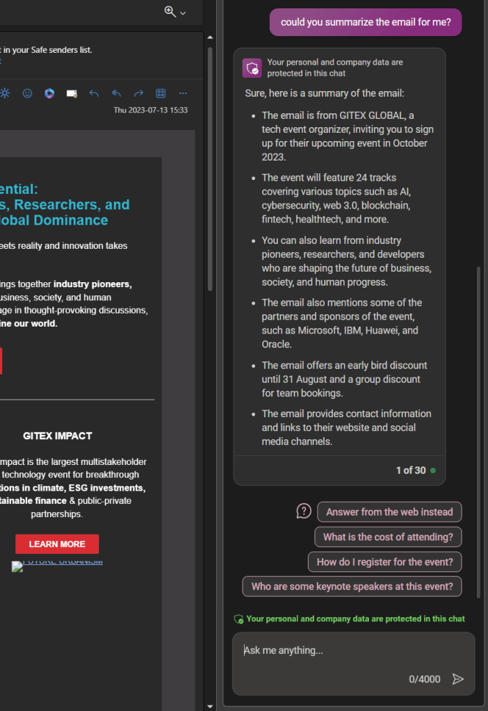 And nothing is stopping from using Bing Chat Enterprise with Outlook Online.