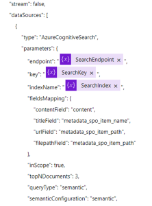 This is only the section, in GPT-model API call, regarding using own data source. There it is defined that it uses Azure Cognitive Search with index. Field mapping is the default one for SharePoint Library connected to ACS. I only fetch top 3 documents, but that can be expanded to 5 easily. Query type is semantic with extremely imaginative semantic configuration name “semantic”.