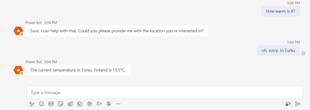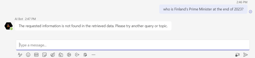 Another great parameter is inScope, which limits the language model to answer to the prompt based only by the data that was found with query. This means less (or none) hallucination since model doesn’t invent answers out of the thin datastream. For demos I have built a bot with Power Platform that gets the data from a SharePoint Document Library.