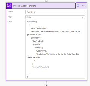 In the example I have described get_weather that needs one parameter: city location that can be such as Helsinki, Finland or Seattle, WA, USA. AI converts our request to correct parameter format. Description of both function and parameters are very important since they are the key how AI determines when those functions need to called.