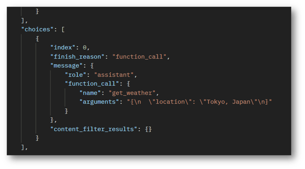 This is the response from call, telling that finish_reason is function_call that needs to be done. In the demo I call Azure Maps API to retrieve that city’s temperature.