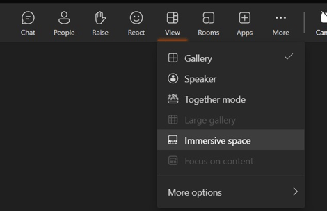 You can join an immersive space from a Teams meeting by clicking on the View icon in the meeting toolbar and selecting the option to change the meeting view to Immersive Space. Once you select an immersive space, you will be transported to 3D experience. Other meeting participants can also choose to switch to the immersive space.