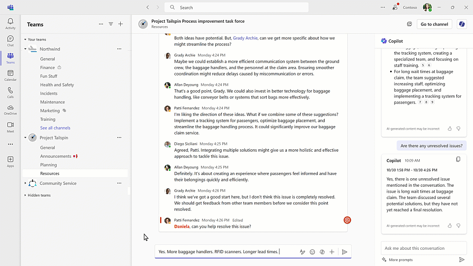 - Copilot is also available in Teams channels to summarize and synthetize key information from past conversations. When composing a message in Teams channels or chats you can use the compose box Copilot to help write or rewrite messages. Available now.
