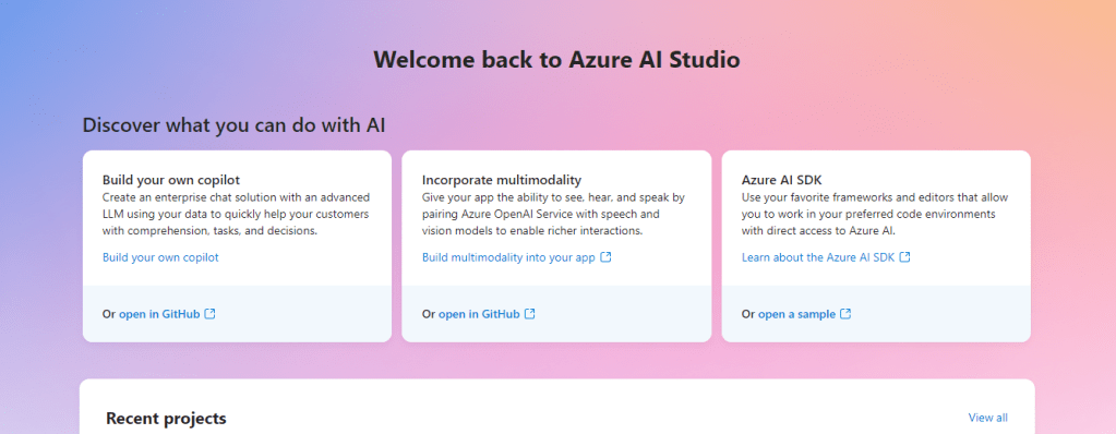 Preview of integrated AI platform was introduced. Now it is possible to manage and create AI experiences from one Studio, instead of having separate studios for different Azure AI capabilities.