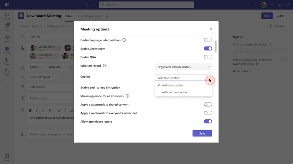 - Use Copilot in Teams meetings without retaining transcription. This is a Teams Admin Center setting where Copilot can be enabled to work within meetings without recording and transcribing. This way you can interact with Copilot during the meeting, such as asking questions, but after the meeting ends Copilot is not available. This is already available.