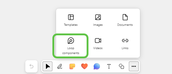 The way to create Loop components in the Whiteboard is something you just need to know – or bump into those by accident when you are adding images or videos to the board. They can be found under … menu in Whiteboard toolbar.